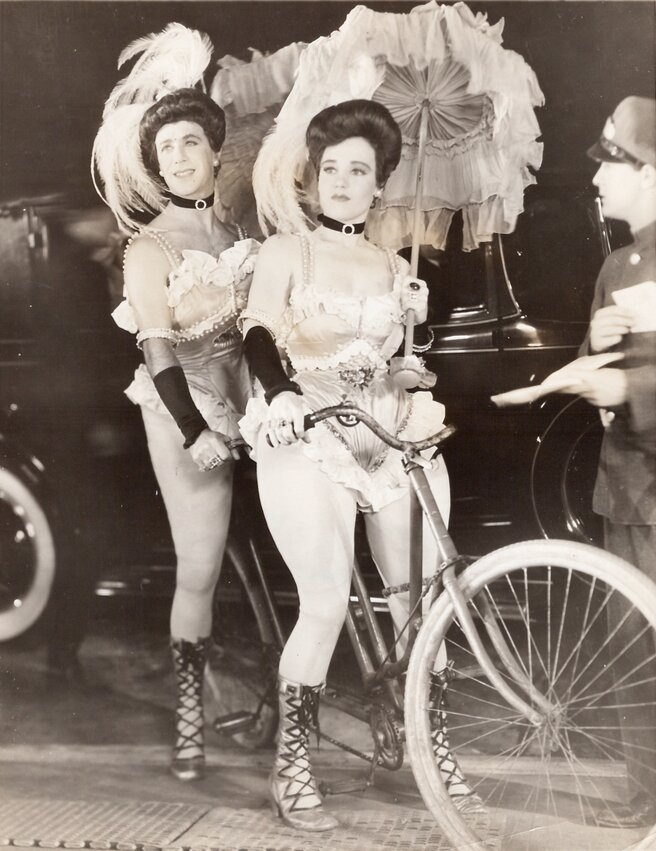 Constance Cummings, actress, shown here (right) arriving with her husband, British playwright/parliamentarian Benn Levy, at a Gay Nineties-themed party in 1933.