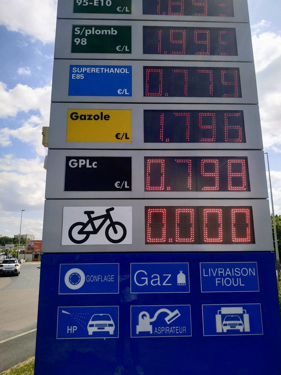 A #Reims, on n'a pas (encore) de super pistes cyclables, mais on a un pompiste super qui promeut l'usage du #vélo ! 🚴😂