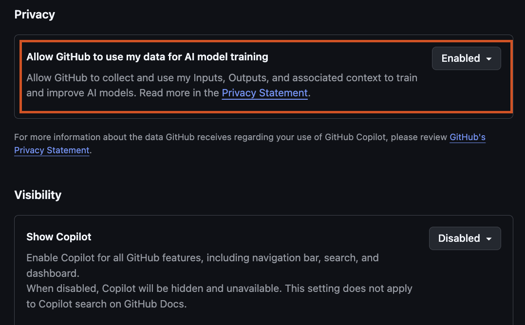 Also Microsoft enabled #github to collect all your "inputs, outputs and associated context to train and improve AI models". This new tickbox is enabled by default, even if you explicitly disabled Copilot before.