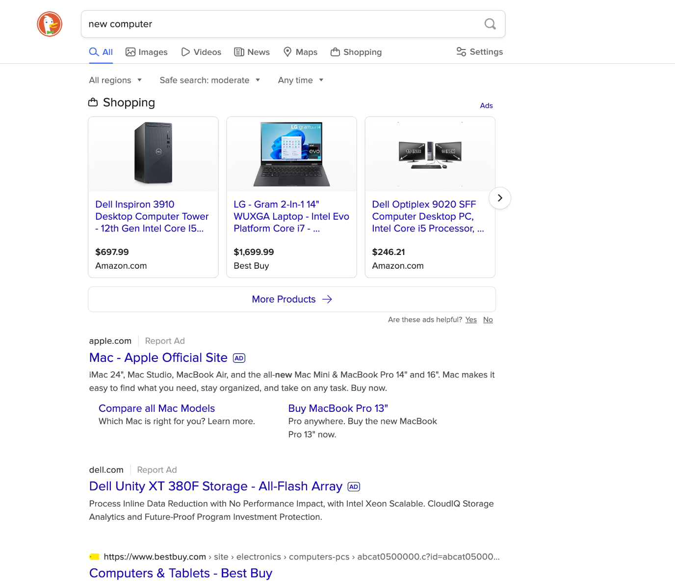 (As a side-note: did the search in DDG for idle curiosity. Lower-density of information; the first organic result is Best Buy and is still way at the bottom of the page. But FWIW, I don't also see a Best Buy ad above it, so maybe DDG is still more ethical?)