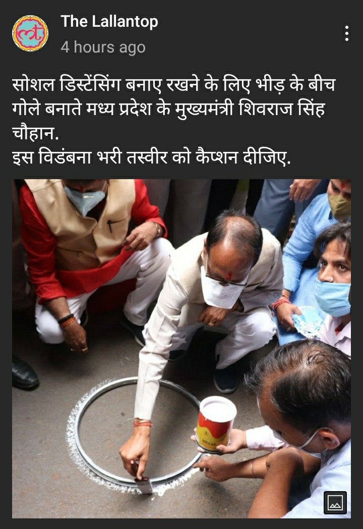 To encourage maintaining SOCIAL DISTANCING the Chief Minister of the state of Madhya Pradesh draws circles on the ground with chalk to show where to stand while a large CROWD is gathered around him.
