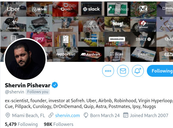 I am clearly a little vain considering it makes me smile that the VC who funded the hyperloop project (and air b&B, uber, slack, postmates, etc) and is often seen along old pictures of Obama at the white house follows me on twitter...