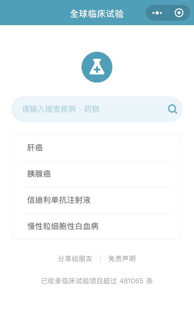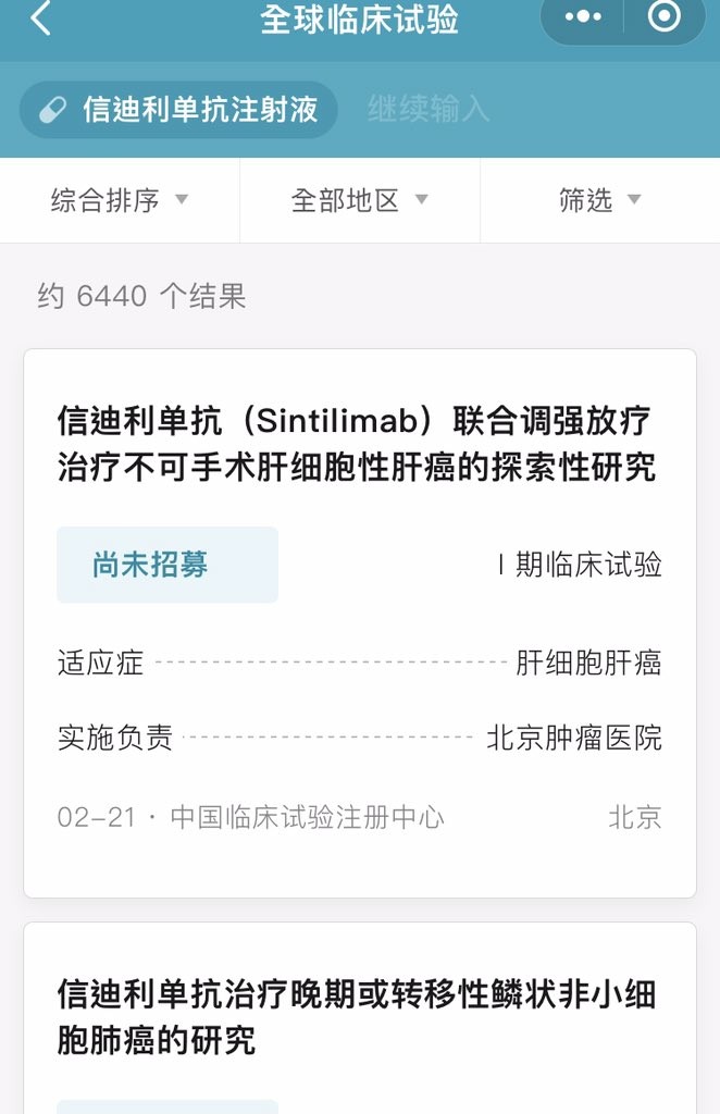 感谢@Jooonah679 推友推荐的“全球临床试验”小程序。如图,它可以在微信上找到。对重症又用不起昂贵药物的病友来说,这无疑提供了一个救命的方法。比如需要使用PD-1类药物信迪利单抗的病友就可以搜索找到国内的研究中心,入组成功就有机会免费用药。twitter.com/jooonah679/status/ twitter.com/fading_you1/status