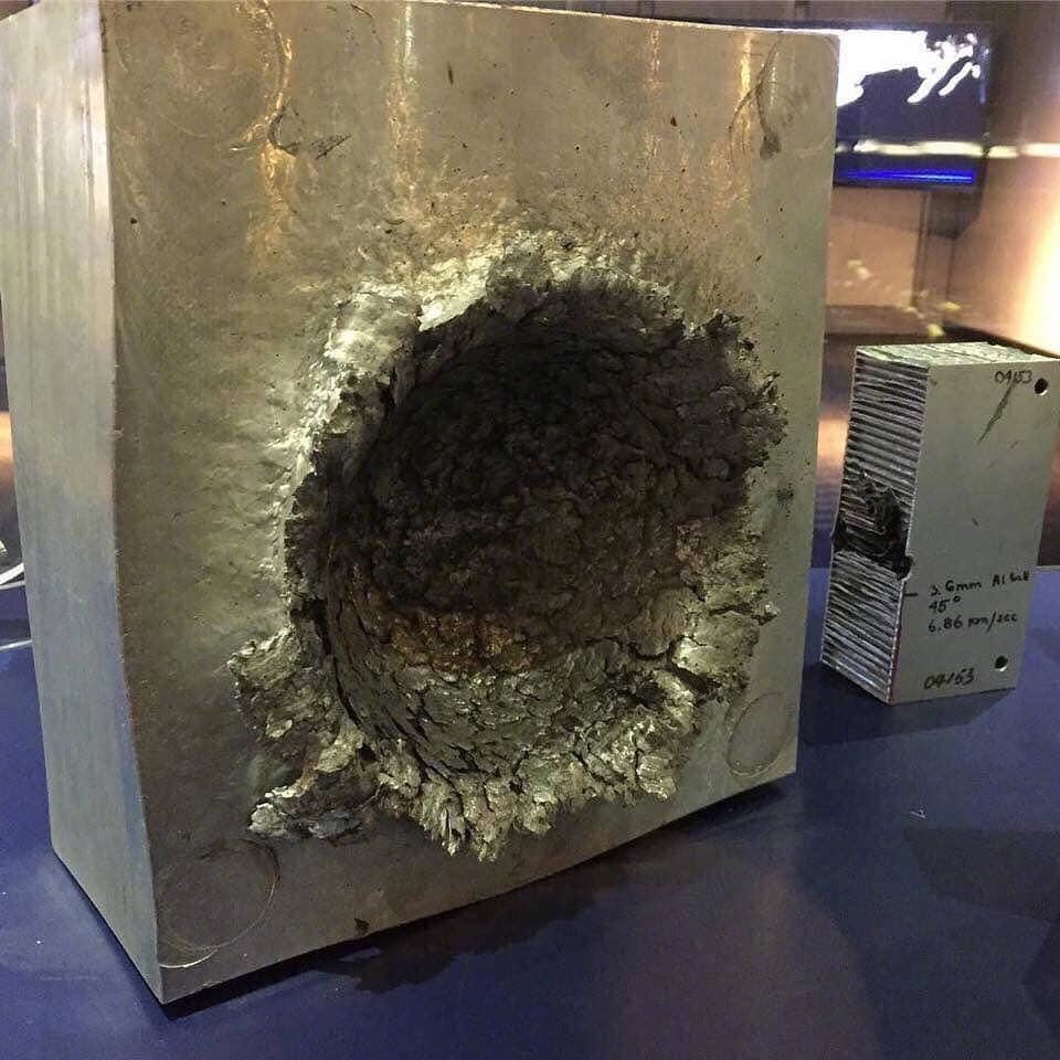 Unknown source 👉1厘米大小的一块塑料,以每秒6.7公里的速度,撞上一大块铝板,会砸出这样一个大坑——这就是太空碎片的可怕之处。图片来源:Erik D. Reedy