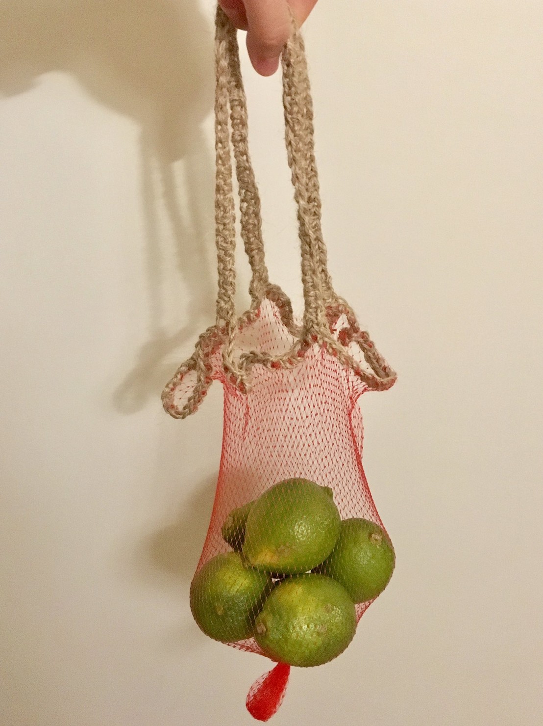 買水果之類得到的塑膠網袋很難再拿來用,試著把開口用麻線鉤邊再加上提把就是一個好洗快乾的提袋了,袋身太長時打個結就能調整,買水果時很方便。只要會鉤短針就可以做出來 😊 https://twitter.com/miau715/status/1127455140980637696