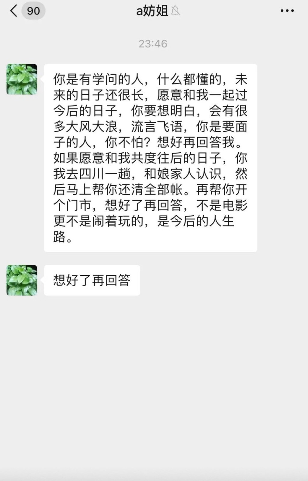 我30岁,因为创业失败欠了36万。在期间认识一个姐姐,比我大17岁。我所有的事他都知道,今天给我说了这些话,我不知道该怎么回。我是需要钱,可我不想以这种方式获得。内心很惶恐。我该怎么办?? https://twitter.com/lvmaoshetuite/status/1128937525437841408