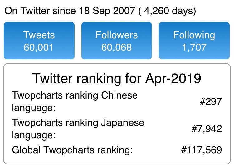 啊,刚刚这个账户提示我发的推文超过了60000。刚好Followers也超过了60000。上推4260天。 https://twitter.com/twopcharts_zh/status/1129723409129197569 https://twitter.com/StarKnight/status/1129725915125223424
