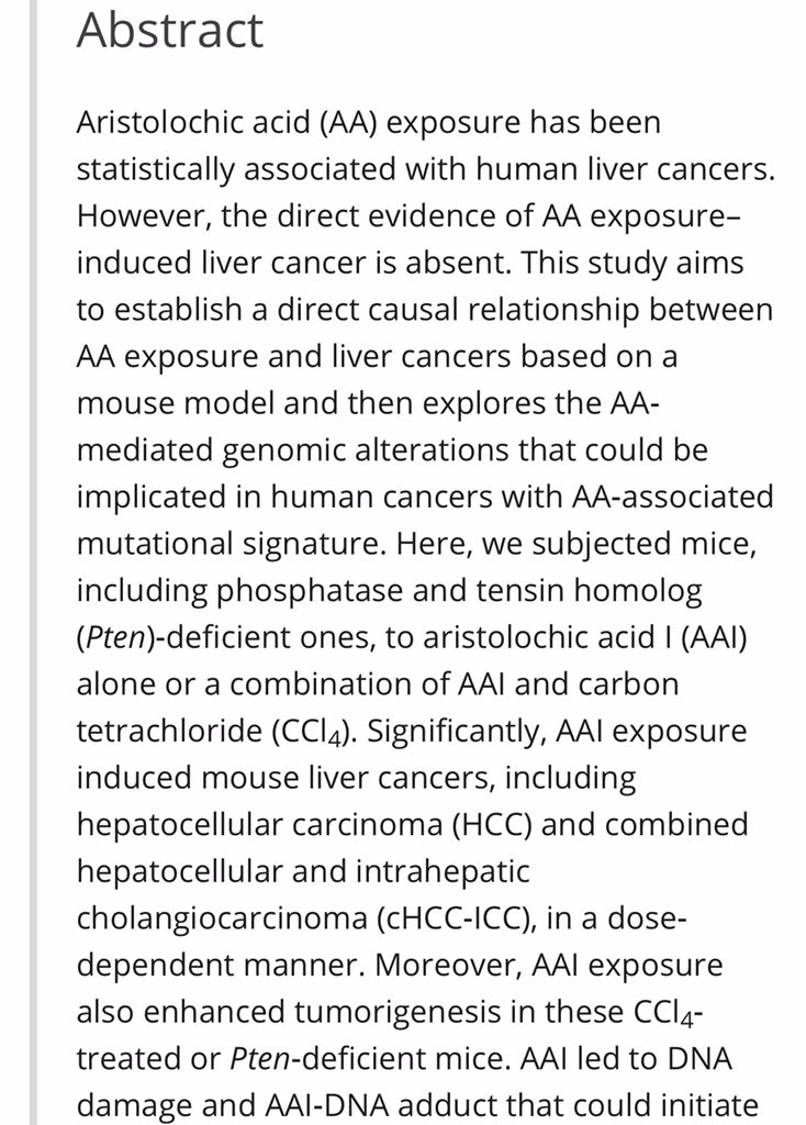 上海交大韩泽广团队用动物实验证明广泛使用的马兜铃科中药中的马兜铃酸能导致肝癌,并发现中国肝癌病人大约四分之一能从癌细胞中检测到马兜铃酸导致的致癌突变。中国肝癌高发的因素之一。 <a href="" target="_blank" rel="noopener"></a> <a href="twitter.com/fangshimin/status/" target="_blank" rel="noopener">twitter.com/fangshimin/status/</a><br><br>