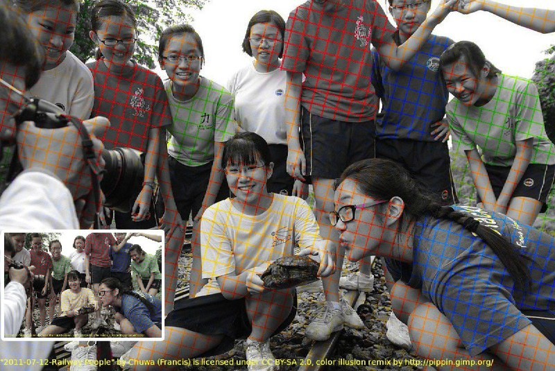 這實際上是一張黑白照片! 只是增加了彩色的網格線! 人腦就自動腦補成彩色了!<br>(近視的人眼鏡拿下來看就會變全彩照片) <a href="" target="_blank" rel="noopener"></a> <a href="twitter.com/sodasga/status/115" target="_blank" rel="noopener">twitter.com/sodasga/status/115</a><br><br>