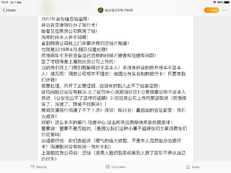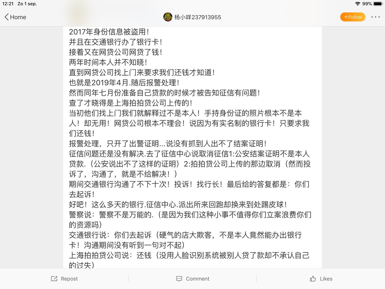 投诉无门的日常。难怪我父母听说自己身份证号被冒用又生气又紧张,别看嘴上说中国好得很,心里其实非常害怕,因为很清楚一旦有什么事是没有任何地方可以说理讨公道的。 https://twitter.com/big_ear_cat/status/1168107618386288640