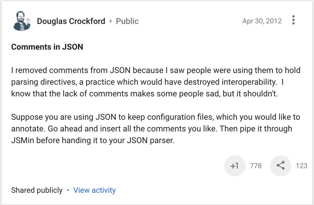 JSON originally had comments. They were removed. (This was explained on Google+. Then Google removed the explanation. Luckily http://archive.org/ saved it.) https://twitter.com/davidcrawshaw/status/1178478240970600450