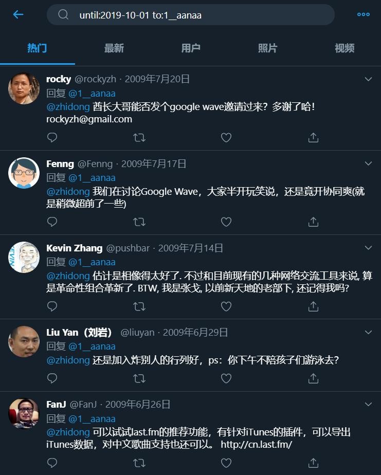 1:使用推特搜索until:2019-10-01 to:1__aanaa即搜索10月之前曾经回推给他的用户(9月底这个账号被重新启用),见截图1,原id为zhidong