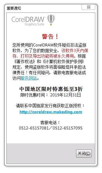 最近几天打开或者关闭CorelDRAW软件的时候总会弹出下图,恐吓我说是盗版软件会有重要功能限制,老子可是花了几千大洋买的正版,找到他们客服质询,他们看过截图后说没事,全都弹窗了,这是他们的广告。操了,这么做广告的真是第一次见。对,就是有人吐槽过的苏州思杰马克丁 https://twitter.com/lowswet/status/1187274616848314368