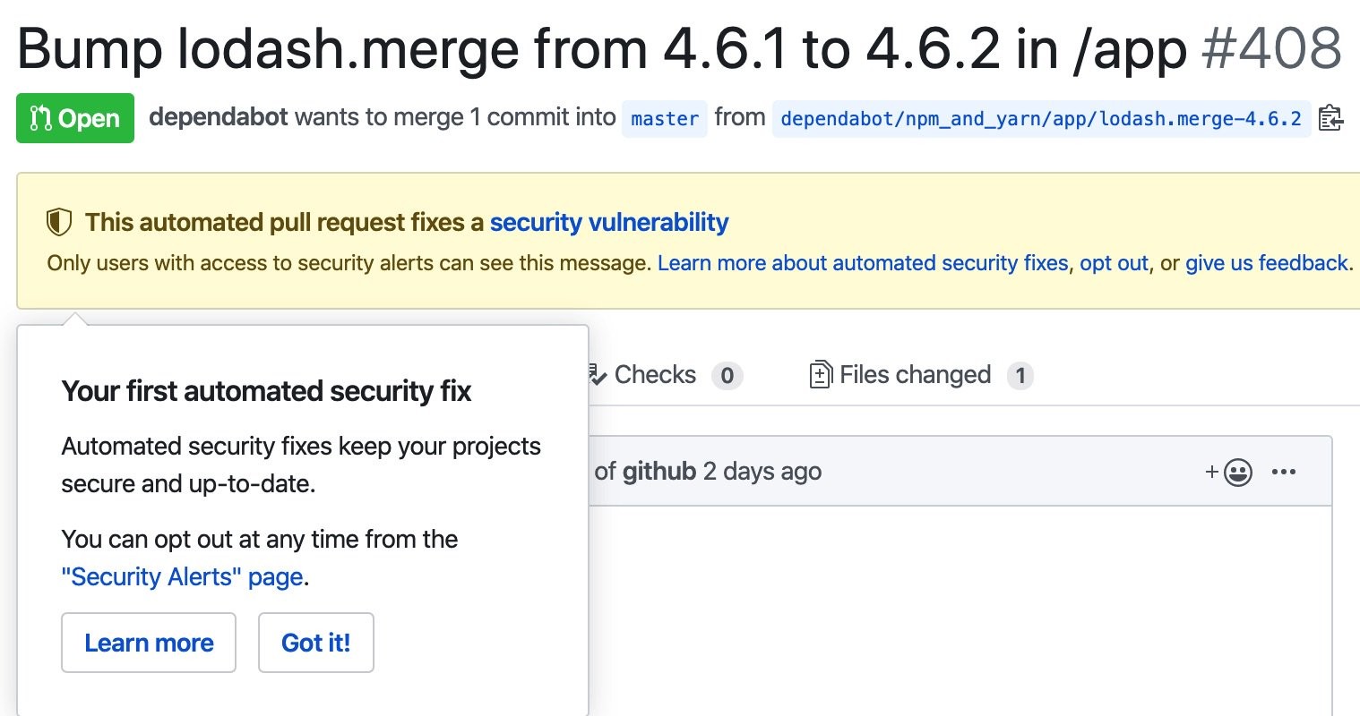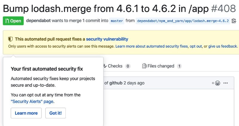 GitHub 会自动给项目提交修复安全问题的 pull request 了。😲 https://twitter.com/oldj/status/1191179850947543040