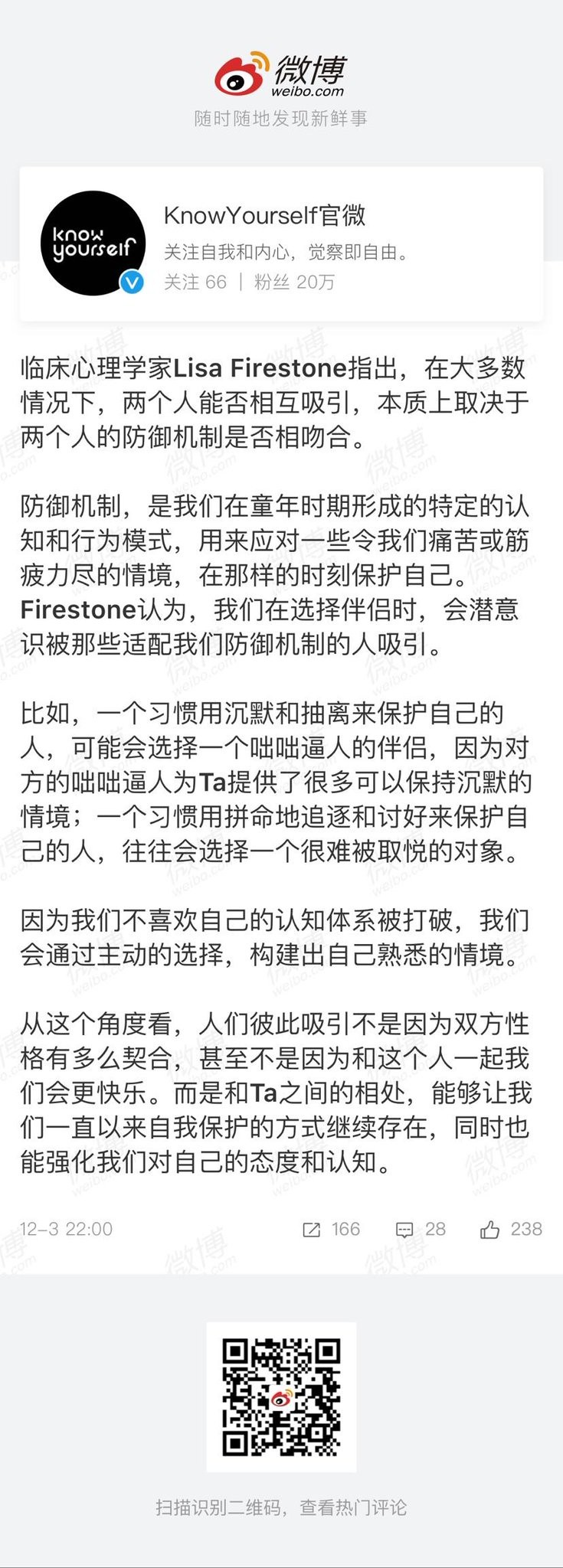 临床心理学家Lisa Firestone指出,在大多数情况下,两个人能否相互吸引,本质上取决于两个人的防御机制是否相吻合。我们在选择伴侣时,会潜意识被那些适配我们防御机制的人吸引。 https://lvv2.com/t/1847345/ https://twitter.com/lvv2com/status/1201956513214021639