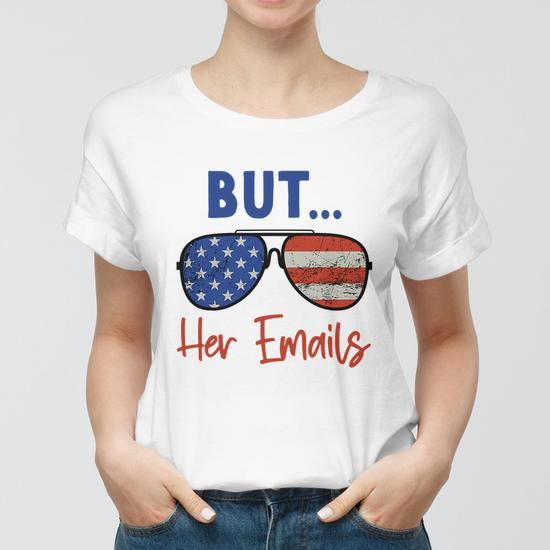 1. **#ButHerEmails** — прямое отсылка к мему, связанному с Хиллари Клинтон, и основной лозунг на футболке.