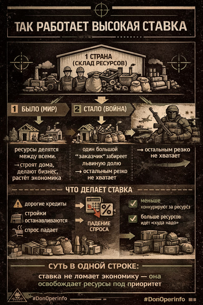 Когда упырь приказывает бросить ресурсы страны на войну, его верные и, надо отдать должное, грамотные слуги исполняют это через деньги. Высокая ставка — не причуда ЦБ, а способ задушить гражданский спрос, чтобы труд, металл, станки, люди и энергия ушли туда, куда велено, — на войну.