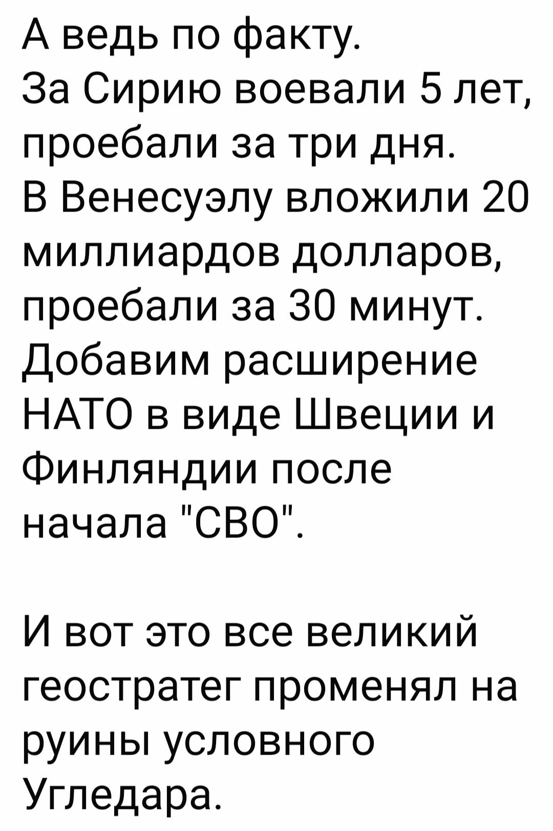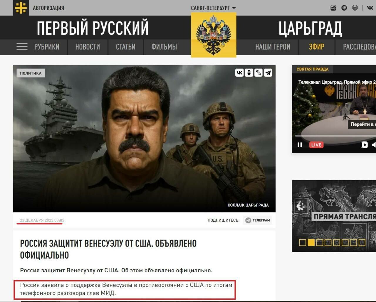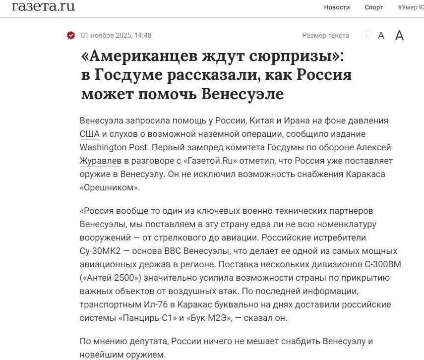 Типичный пример: где-то за неделю до выковыривания Мадуро американцами рабсеянский пропагандон бредит по вопросу Венесуэлы. Это для понимания пересечения рабсеянской пропаганды с реальностью. В реальности про успехи рабсеюшки в Сирии и Венесуэле можно снимать комедийные сериалы... 😂 По всем другим вопросам уровень пропаганды бьется с реальностью примерно так-же.