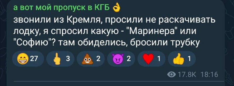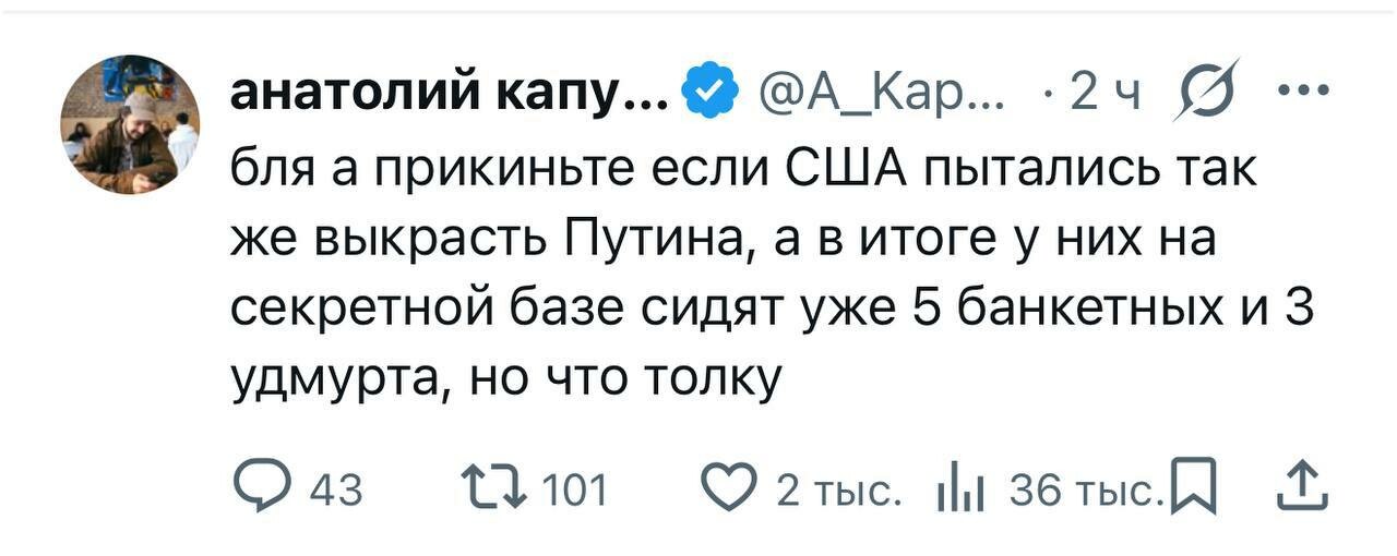 И что, мадурка, помогли тебе твои москали? Схема все та же что была в Сирии и Иране. Истошный визг рабсеянской пропаганды, типа Армения, Сирия, Иран, Венесуэла…надежный союзник и что ему будет оказана вся необходимая помощь в случае противостояния. Всякие заявления официальных лиц в стиле «мы не допустим», «мы дадим жесткий ответ», «окажем любую помощь, которая понадобится»… По факту, рабсеюшка каждый раз жидко сходила под себя. МИДа хватило на глубокую обеспокоенность и призывы в стиле «верните Колю обратно». Царь сейчас вообще ничего не говорит ртом, а издает рычащие звуки нижней частью фюзеляжа в секретный чемоданчик. Представляя себя на пути в гаагский трибунал. И по факту-же получается, что Трамп устроил рабсеюшке маленькую победоносную прокси-войнушку, да? И тут же выиграл ее, без всяких со стороны рабсеюшки «сюрпризов», да? А кто-кто у нас на планетке еще заинтересован проверить, действительно ли парашка милитарно импотентна настолько, как показала себя в Украине? 😂