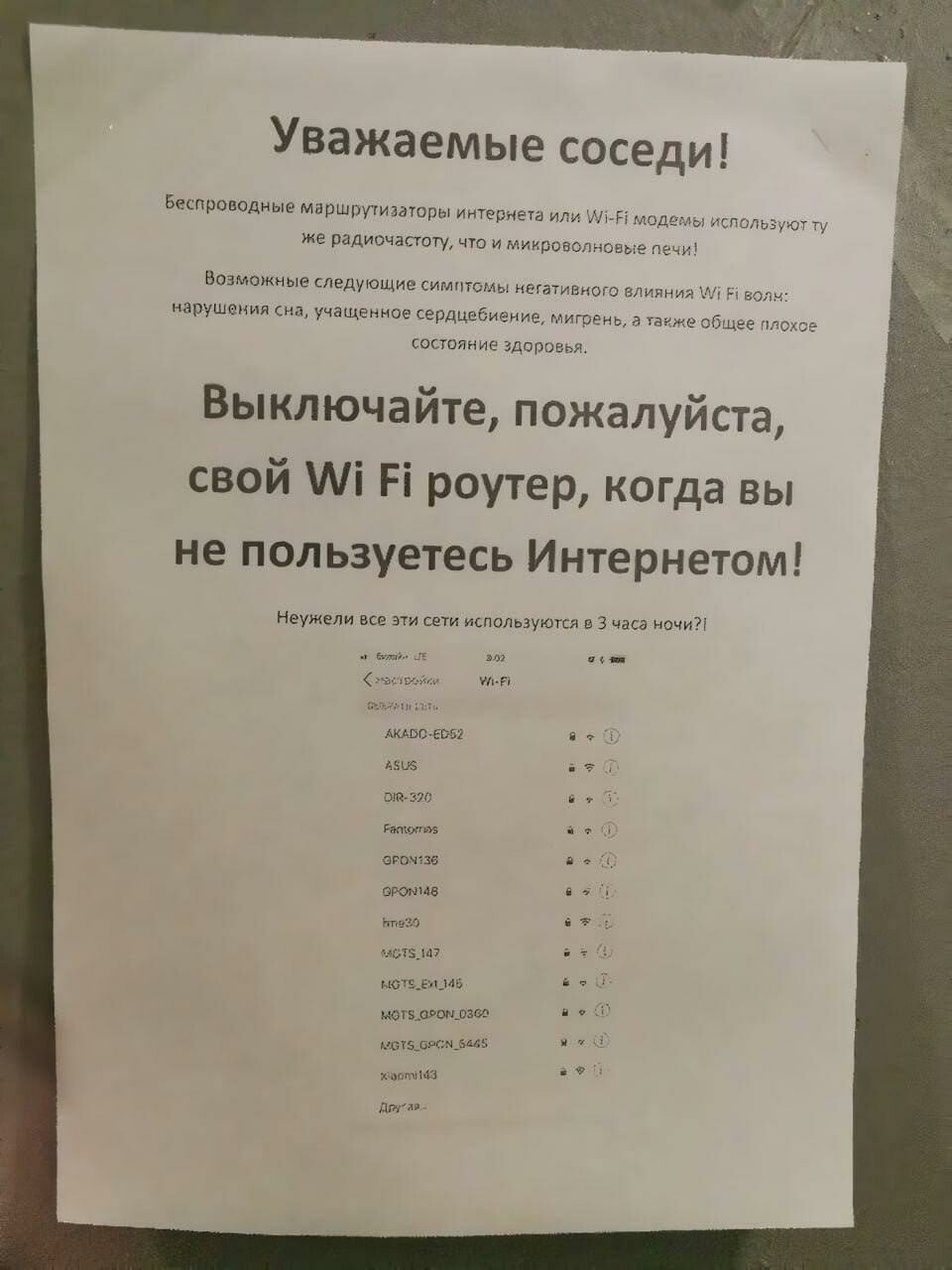 Имейте же совесть - не всем удобно спать в шапочках из фольги! Наконец-то радиолюбители с облегчением выдохнули: очередь от их антенн дошла до интернет-роутеров. Но что изумляет, всех этих борцов за безопасность и здоровье совершенно не беспокоит достаточно мощный (до 2 Вт.) высокочастотный передатчик мобильного телефона, который они часами держат у уха (мозга) и который в тысячи раз больше облучает, чем роутеры. Но это так... А соседи могли бы как то попозитивнее переименовать свои роутеры - там «фолиевая шапочка», "5G вышка" или «рак мозга»… 😂