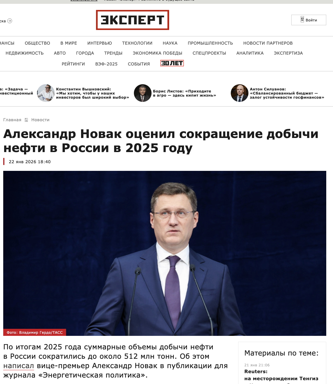 «Производство нефти в России по итогам 2025 года сократилось и составило 512 млн тонн, сообщил в статье для журнала «Энергетическая политика» вице-премьер Александр Новак. Нефтедобыча, как следует из данных Новака, упала третий год подряд: в 2024 году это было 516 млн тонн, в 2023-м – 530 млн тонн, а в 2022-м – 535 млн. В результате объемы производства нефти стали самыми низкими с 2009 года: тогда Россия добывала 494,2 млн тонн. Даже во время кризиса пандемии, в 2020 году, добыча была немного больше – 512,7 млн тонн».