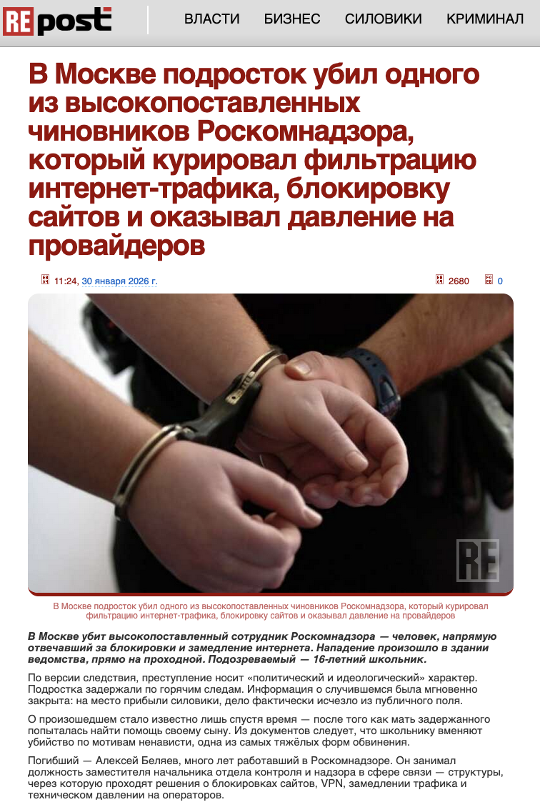 В Москве прямо на выходе из ведомства зарезан один из высокопоставленных руководителей Роскомнадзора Алексей Беляев, отвечавший за блокировки и замедление трафика интернет. Убийство произошло еще 19 января, однако ФСБ полностью засекретили всю информацию. По обвинению в совершении преступления «по мотивам политической и идеологической ненависти» задержан 16-летний школьник.