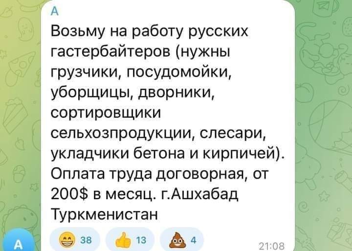 Не исключено что в Душанбе сделают сейчас юмористическое шоу Наша Таджикисташа и там любя, по доброму, шуточно будут показывать Ивана и Степана бежавших от мобилизации работающих грузчиками. Правда на фарси они могут только здороваться. И то без слов, просто махая рукой. И начальник Басир который будет считать что они максимально тупые потому что не знают фарси. А они между собой будут говорить о Чайковском и о Репине.