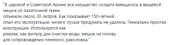 А ещё будёновка, в отличие от тяжелых и неудобных касок легка, в ней тепло, хорошо закрыты уши, запросто можно положить в карман на весь летний период. Я бы также рекомендовал отказаться от тяжёлых громоздких автоматов. Винтовка со штык-ножом - удобно, практично, универсально. И ещё праща. Праща обязательно. Патроны могут закончиться в самый неподходящий момент, а камни практически всегда под рукой. Кстати, в ходе всех войн последних столетий среди убитых солдат не было ни одного, вооруженного пращой. Стоит об этом задуматься. Вещмешок заодно использовали как ёмкость для хранения нечистот, презерватив и как перевязочный материал на открытые раны. Царско-советская инженерная школа. Накатим.
