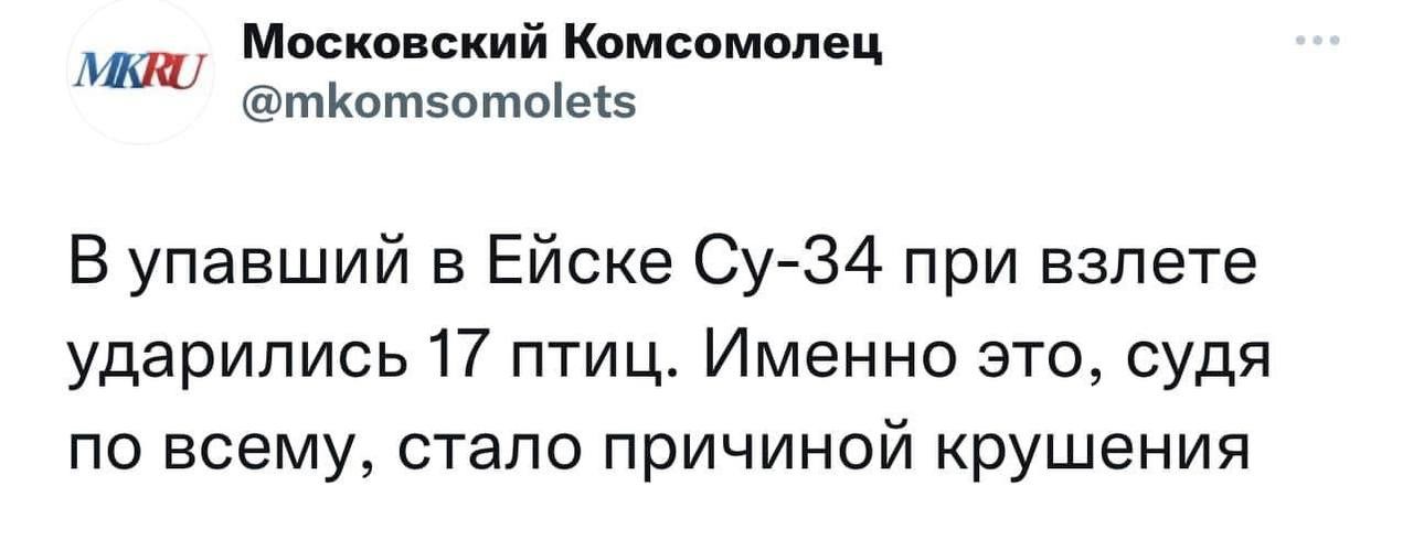 Разумеется, это были птицы из биолабораторий НАТО. Интересно, как они определили количество птиц....по дыркам от клюва в фюзеляже?! Хотя я прикинул, это элементарно! 34 / 2 = 17. Вот чтобы завалить Ту-104, нужно ровно 52 птицы. А Боинг-737 - так вообще 368 птиц и еще муха вдобавок. Правда самолет упал ночью, а птицы ночью спят. Летают ночные хищники. Одиночками, не стаями. Исходя из фактов одному мне кажется, что самолет гонялся за птицами и заставлял их врезаться в себя? Это как читаешь полицейский протокол - самоубица упал на нож. И так 17 раз.