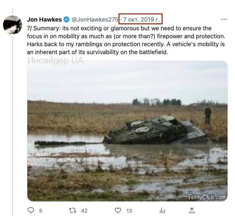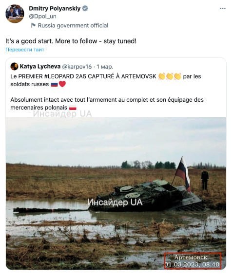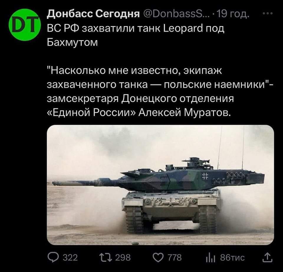 На парашке новая истерия. Раньше они ежедневно «уничтожали» Хаймарсы пачками, теперь «уничтожают» Леопарды. Заместитель постпреда РФ в ООН Полянский распространяет уже классический фейк о якобы первом захваченном Леопарде. На самом деле, фото с учений 2019 где-то на просторах европейских полигонов, где неумелые солдаты загнали танк в непроходимое болото. Небензя (один из самых высокопоставленных дипломатов РФ) фотошопит туда рашистский флаг и пишет, что это трофей, захваченный 1 марта этого года. 😂 🤣 😂
