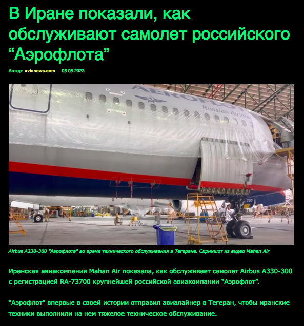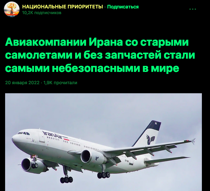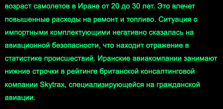 Деградация гражданской авиации на РФ. Для понимания, Иран уже давно не имеет доступа к официальным источникам сервиса и запчастей для самолетов. Поэтому они вынуждены «колхозить», применяя контрафактные запчасти неизвестного происхождения, скупая старые самолеты и разбирая их на запчасти. Соблюдение процедуры ремонтов и техобслуживания самолетов, квалификацию авиатехников производители не контролируют, доступа к официальной документации с последними изменениями и улучшениями у иранцев тоже нет. Как результат - иранские авиакомпании считаются одними из самых небезопасных в мире. Хуже даже большинства африканских авиакомпаний. Летать они могут только внутри страны и по тем ебеням, куда не летает больше никто. Аварийность соответствующая.