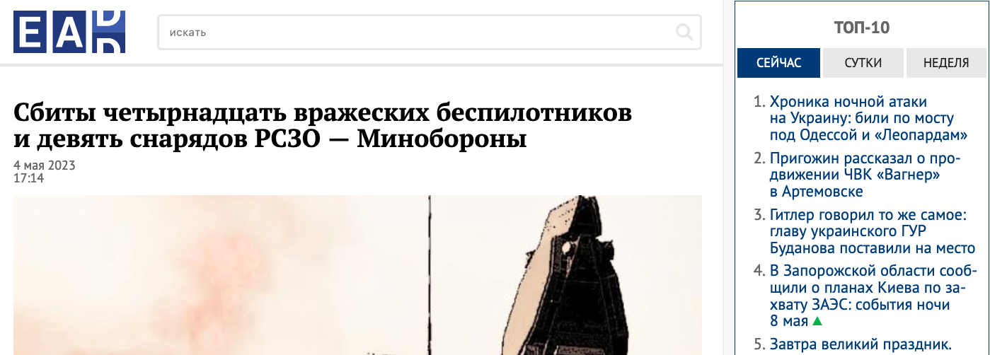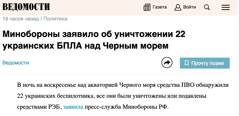 Роспропаганда опять включила избитый шаблон. После серии успешных ударов украинских БПЛА по инфраструктуре обеспечивающей логистику оккупационной группировки войск лохам надо срочно навесить на уши успокоительной лапши. Пошли интенсивные истории про массовые сбития БПЛА, баллистических ракет, реактивных снарядов и бог знает какая еще дичь придет пропагандонам в головы. Ранее пропаганда уже уничтожила Хаймарсов больше чем их сделали, Леопарды которых на тот момент не то что на фронте, их еще в Украине не было. Полностью уничтожили украинскую авиацию еще в феврале прошлого года и если я правильно помню, даже несколько раз, если кто с первого раза не поверил. И пр. и пр.