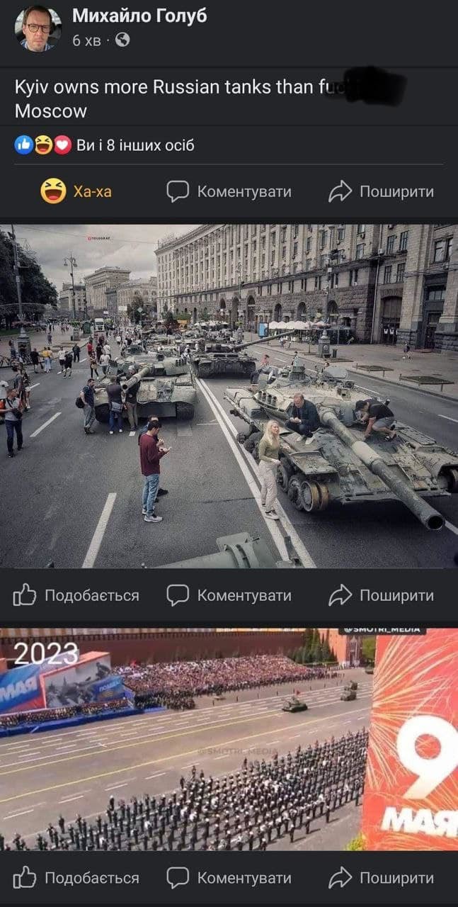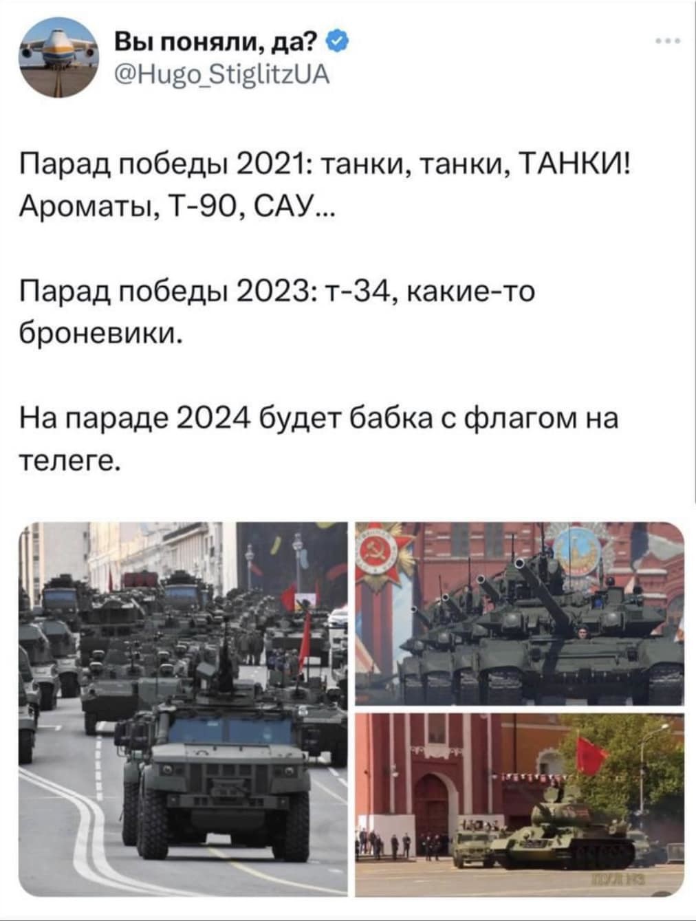 Небольшая подборка реакций на вчерашние маасковские конвульсии. Особенно «страшно» было смотреть на танковую армаду и авиацию-невидимку. 🤣 😂 🤣 Предпоследняя фоточка - парад уничтоженной рашистской техники в Киеве, август 2022 г. На последней картинке - московский парад 2024г. Если РФ дотянет до той поры конечно. 😉