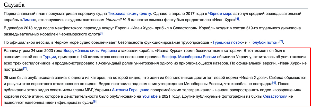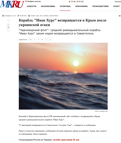 Во время атаки двумя морскими беспилотными аппаратами корабля специального назначения «Иван Хурс» ВМФ РФ (проект 18280) была повреждена аппаратная часть комплекса радиоэлектронной борьбы "Дивноморье" (разработчик — ВНИИ «Градиент») предназначенной для выявления РЛС противника, командных пунктов, средств ПВО и создания помех деятельности радиолокационных систем обнаружения объектов на участке несколько сотен километров.