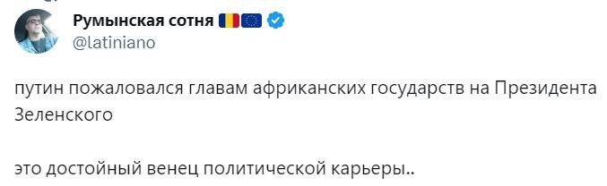 Каких-то десять лет назад хуйло толкал свои речи в составе «большой восьмерки», перед лидерами самых мощных стран мира, а теперь – пытается в чем-то убедить деятелей из Африки. При этом он рассказывает о том, что те разделяют его мнение по поводу войны в Украины и это не шутки, поскольку за этими странами стоит огромный экономический потенциал. Может оно и так, но вся Африка, а не эти шесть стран, имеет совокупный ВВП меньше такового в штате Калифорния. Жду рассказов о потенциале Талибана и его маковой промышленности и о потенциале колумбийских картелей по выращиванию листьев коки.