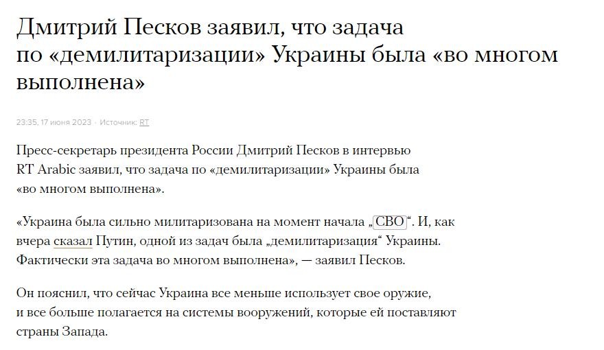 Оказывается, практически достигнута цель демилитаризации Украины. По его словам, это следует из того, что у ЗСУ практически кончилось совковое вооружение и они теперь вынуждены воевать отвратительным западным оружием. Логика здесь просто запредельная, но если следовать ей до конца, то окажется, что за последние годы практически полностью демилитаризировались армии Польши и Чехии, например, или стран Балтии. Ведь они тоже практически полностью перешли на западные системы вооружений и западные же калибры боеприпасов.