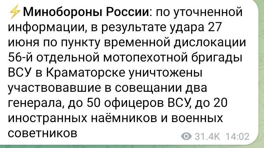 А также - 14 "Абрамсов", эскадрилья F-16 и рота рептилоидов с Нубиру. И 5-6 штук НАТО. И до 15 президентов стран запада. И в век видеоконференций все они решили собраться на совещание именно в пиццерии в Краматорске. Мне кажется, что после окончания войны, конашенков ещё много лет будет продолжать вешать о потерях врага. Если уцелеет, конечно.
