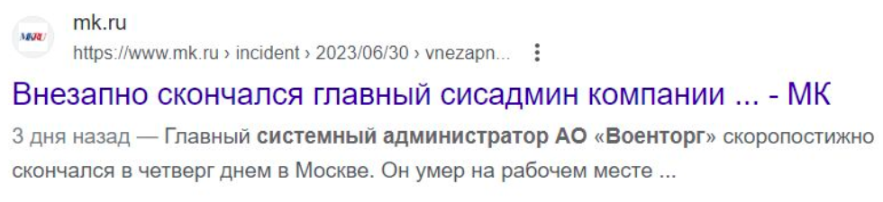 В четверг 29.06.23 на рабочем месте умер гл.сисадмин компании АО «Военторг», которая сотрудничала с Пригожиным.
