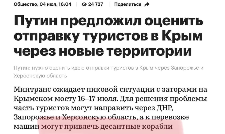 А контракты с МОРФ туристам надо перед выездом подписывать или уже по прибытии в Крым доехавших? Кроме десантных кораблей стоит привлечь и заградотряды. Чтобы загорать не передумали. На передовой. 😉