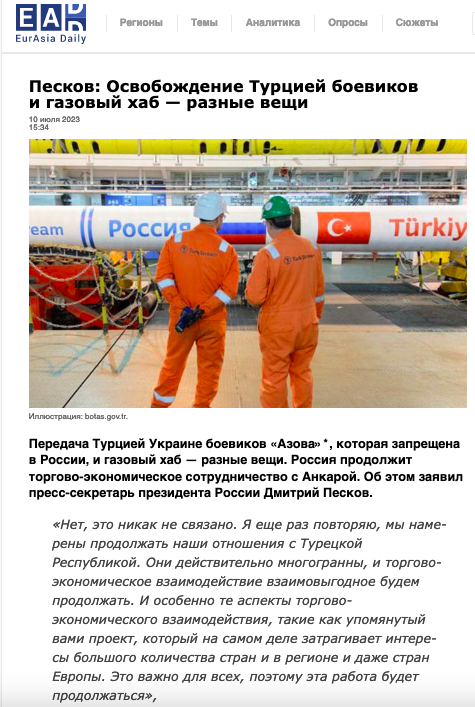 Песков: «По условиям договоренностей главари „Азова“ должны были находиться на территории Турции до момента окончания конфликта. Россию никто не ставил в известность о передаче Украине главарей террористической группировки „Азова“ из Турции».