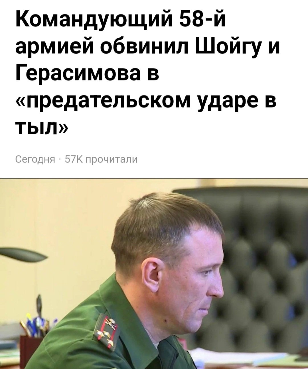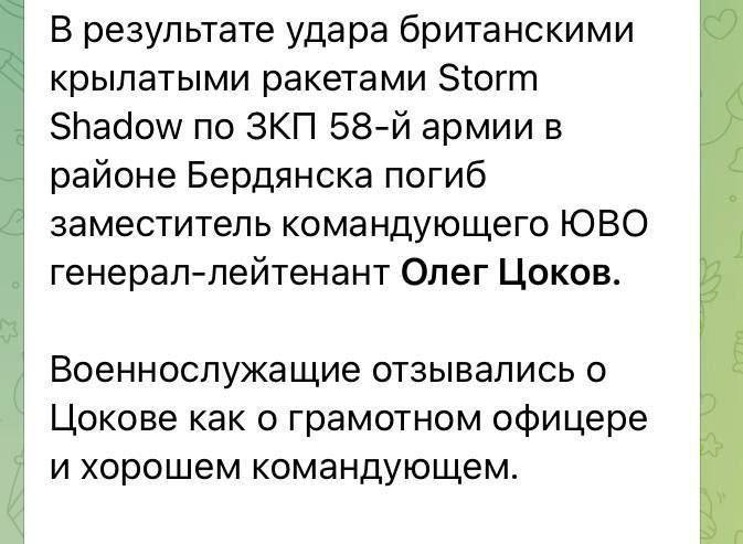 Кстати, командира самой 58-й армии генерала Попова, оказывается, в последние дни сняли "за паникёрство" и отправили на передовую. Чувак выхватил счастливый билет - вовремя сдрыснув со своего командного пункта. Гурулев, сам когда-то командовавший 58-й армией, опубликовал его нытье, что после доклада у Герасимова, где он заявил о больших потерях его армии и "трагедии" с отсутствием контрбатарейной борьбы и массовой гибели и увечий "наших с вами братьев от артиллерии противника", Герасимов обвинил его в разгоне паники, а на угрозу пойти к путину, тут же уволил. Теперь 58-й руководит новый будущий жмур – генерал Лямин.