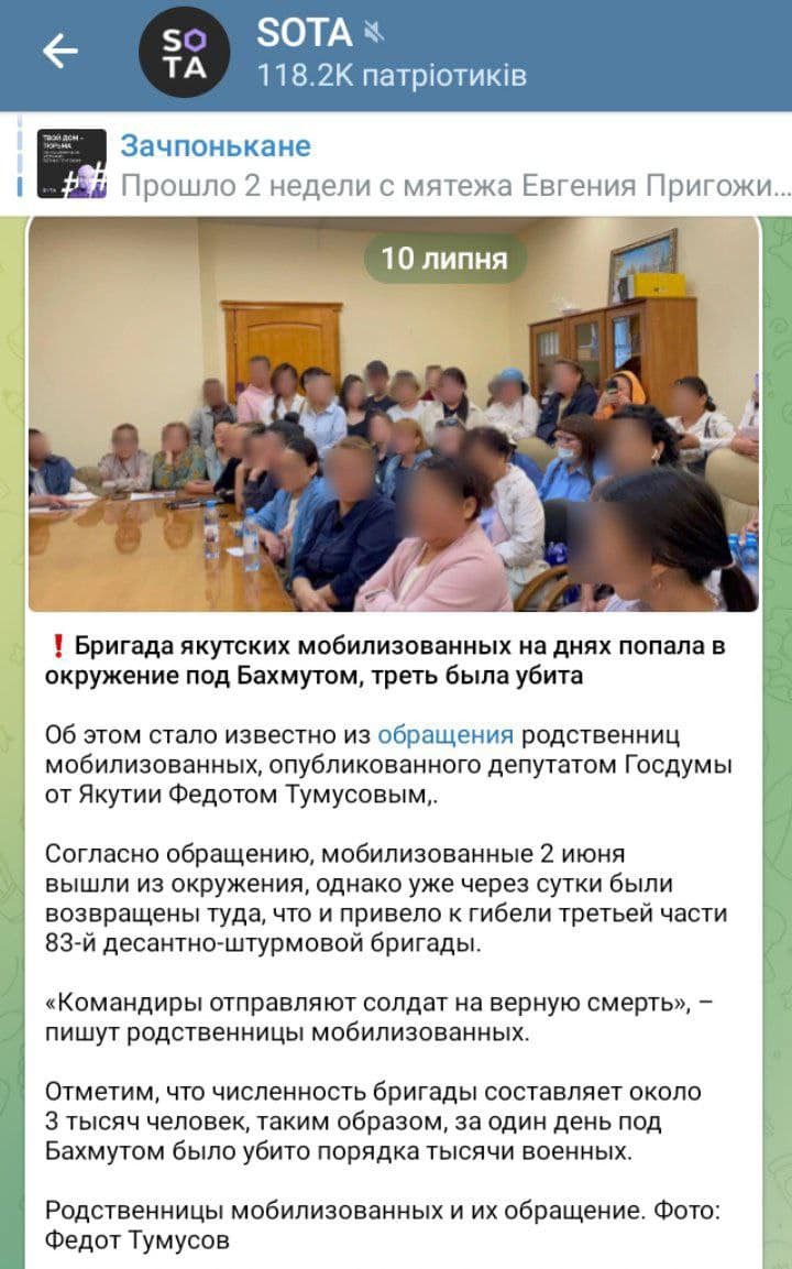 Тетки так рассказывают, как будто это что-то плохое. Пусть выжившим якутским идиотам передадут - надо координаты штаба сбросить. ЗСУ им пошлют «помощь». После этого штаб их больше никуда уже не сможет отправить. Распространенная практика между прочим. 😉