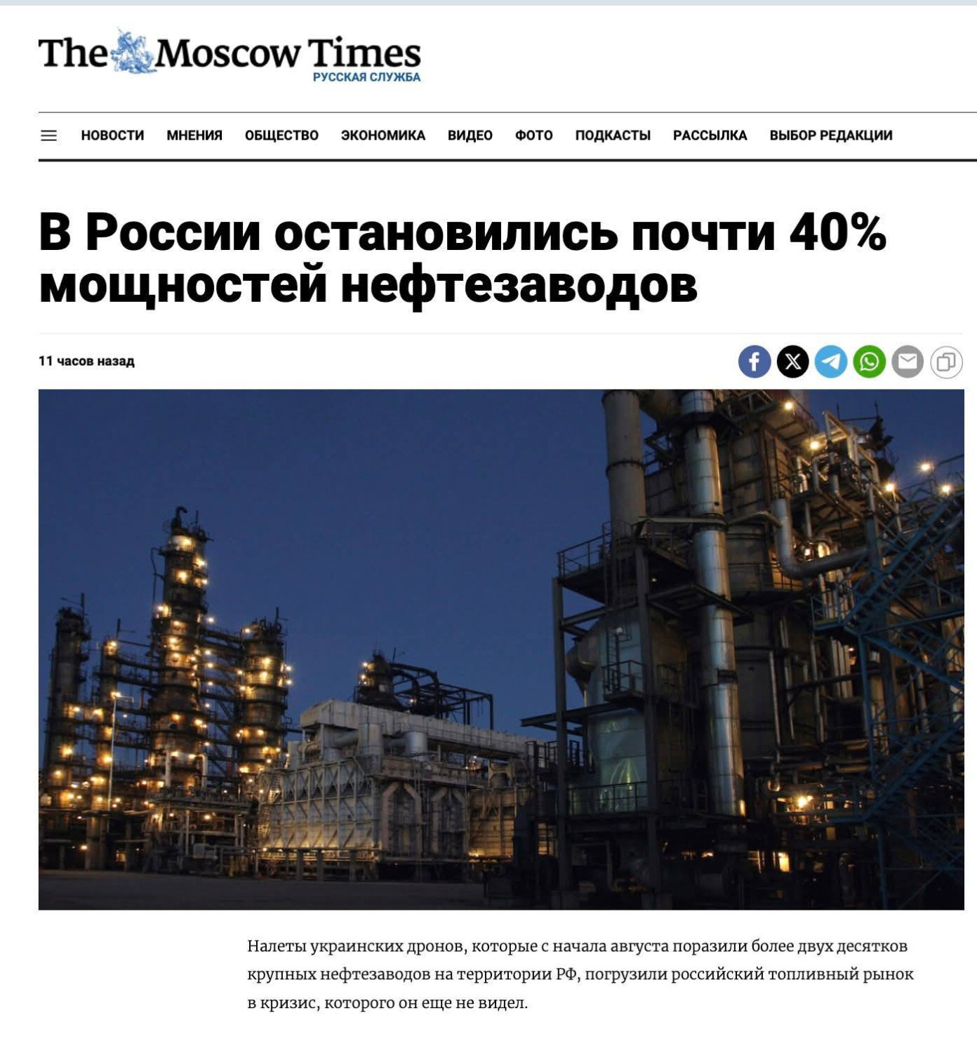 Украинские дроны вывели из строя уже более трети российских мощностей по переработке нефти. Каждую ночь горит еще один НПЗ. Страна-бензоколонка начинает закупать бензин в Китае. С рабсеянского рынка ушли крупные иностранные компании, объем потерянных инвестиций достигает $240 млрд. Потеряны $300 млрд вкладов в западных банках. Резервный фонд проеден. Быстро растут налоги. Денег в долг никто не дает. Начинается стагнация, а во многих частях экономики уже и рецессия. Идет сильнейшая утечка мозгов. Научные связи с миром разорваны. Самолеты разбирают на запчасти. РФ лишилась доступа к критически важным западным технологиям. Страна превратилась в сырьевой придаток Китая… список можно продолжать очень долго.