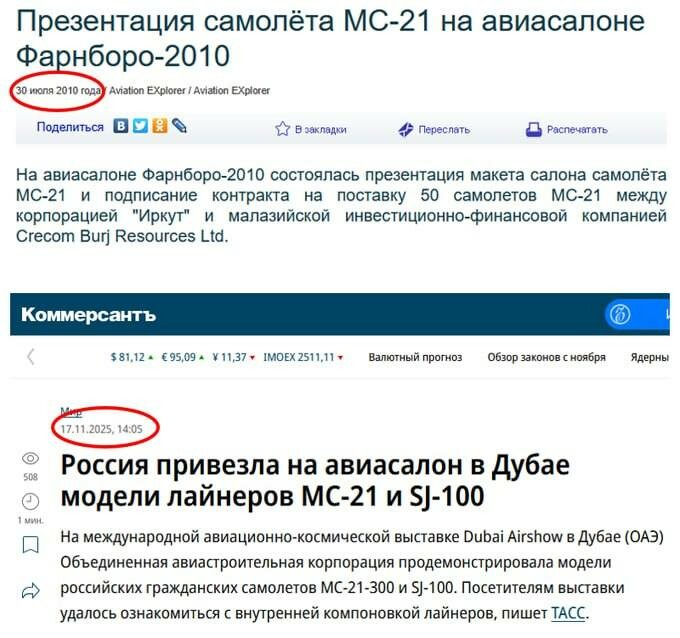 Качество, проверенное годами! Ну и кто теперь скажет, что они умеют только в мультики. Модельки - все по-настоящему!!! Прогресс очевиден: в 2010 году был представлен макет, в 2025 - уже модель, а к 2030 году будет представлено полноценное чучело МС-21. Убийцы Боинга и Аэробуса. Еще в 2010 моделька обе компании убила. Уже пятнадцать лет никто Боинги и Аэробусы не покупает. Все копят деньги на МС-21. Поэтому назад, на парашку, делегация полетит на привезенных моделях. 🤣