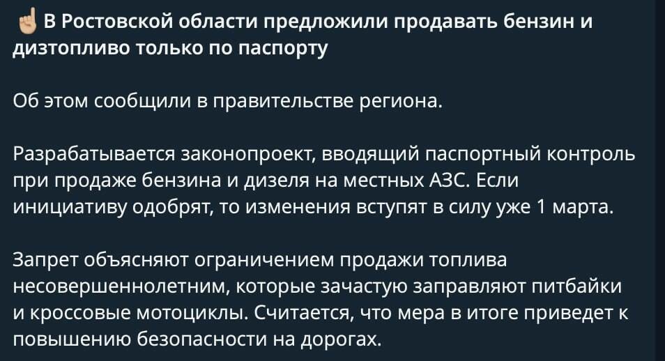 В СССР по талонам продавали. А тут предъяви паспорт-получи бензин! Повестка из военкомата- бонус! Предлагаю вообще запретить продажу бензина. Безопасность на дорогах вырастет в разы! А еще заправляют бензопилы и триммеры , они много чадного газа производят, а вот заправка танков, БТР, БМП позитивно влияет на экологию рабсеюшки. 🤣