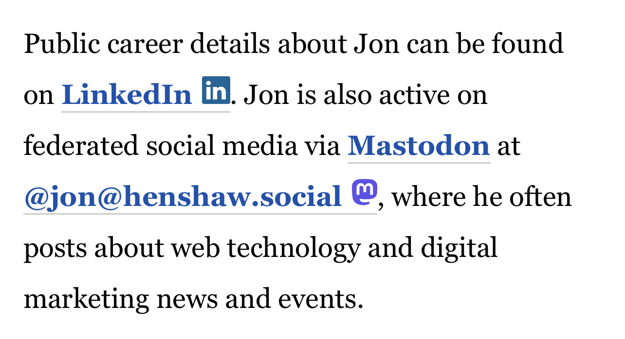 @peterdrake I display the username and server because it denotes what I go by and which federated instance I’m on, but I link it to full URL because that’s the proper link and destination for my profile page.