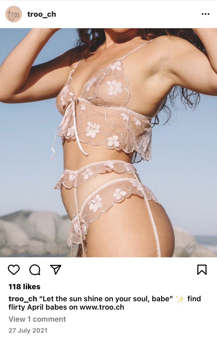 前年我在柏林的一个可持续时尚网站(staiy 上发现了一个瑞士品牌叫troo,总的来说价格就是中端品牌水平,换算人民币大概一个蕾丝bralette四五百,吊袜带两三百,内裤普遍一两百,便宜肯定是不便宜,但是考虑到是手工制作,布料也很软质量不错,而且我个人是觉得真的挺好穿的,颜色款式都是可风骚可活泼可唯美,模特总体身材也比较inclusive,比较适合我们这种爱臭美的人。