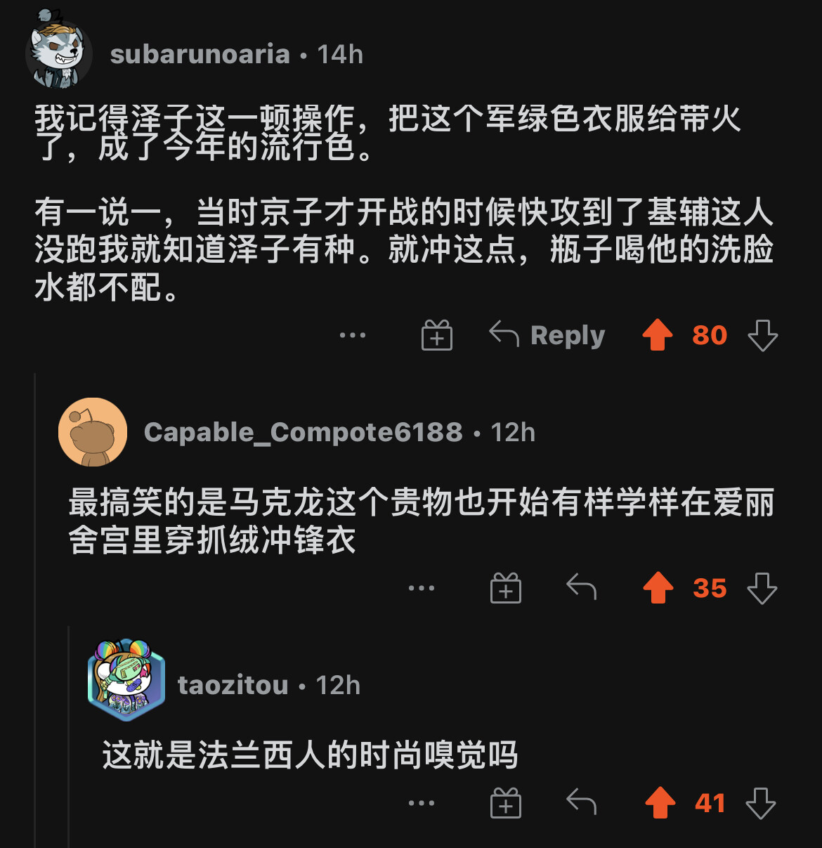 泽连斯基去前线视察,形象刚健,引得世人称赞。然后我在reddit看到p1这几条评论,很好奇于是去问我在法国的友人,然后喜提她对马克龙的一顿臭骂以及p2-p4的超搞笑图片