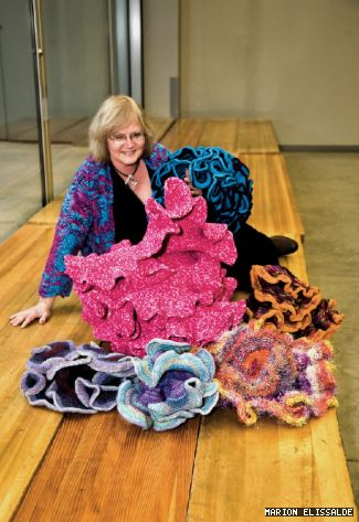 2009年,Margaret Wertheim和她在CalArt任教的双胞胎妹妹想通过钩针编织的方式呼吁人们关注全球变暖对珊瑚礁造成的影响,于是她们和许多女性钩编者一起制作了3000平方英尺的巨大展览,在那之后各地的钩编者和环保人士(99%为女性)踊跃响应,将这个项目推广到了全球(图2为Margaret和她们的钩编珊瑚展品),钩编珊瑚变成了新的艺术icon,也就是为什么我们现在随意搜索就能搜到无数精美的海洋主题钩编艺术品和新手小白教程。而像我这样原本不懂双曲几何也不太懂钩针编织的双重外行,竟然可以通过钩针和毛线非常简单地复原这种数学艺术,感到一种热血上涌的幸福…