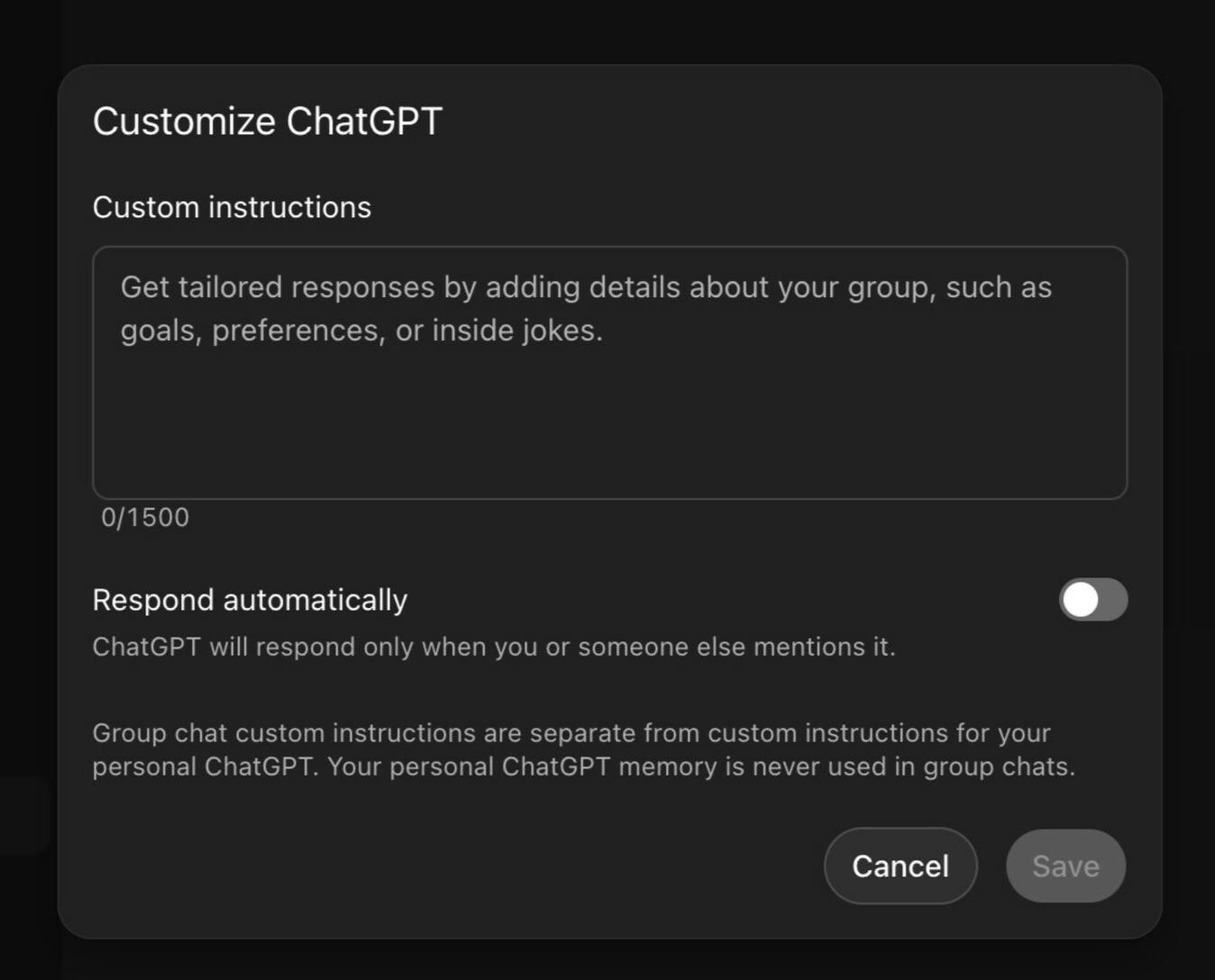 ⚡️**В ChatGPT появятся групповые чаты** Энтузиасты раскопали в веб-версии ChatGPT следы новой фичи «**Group chats**». И воображение сразу взыграло, когда я увидел это название. Сэм Альтман недавно в одном интервью высказался критично о Slack и во что весь рабочий процесс общения превращается. Оказывается, его высказывания были не без почвенные! Но об этом отдельно. Похоже, OpenAI готовит возможность общаться с ChatGPT и другими людьми в одном общем чате. Казалось, что меня уже сложно удивить новыми фичами, но вау, это же просто потрясающий шаг! Замкнуть на себя еще и рабочие чаты, где AI и агенты будут помогать процессам. **Что нашли:** – Появится кнопка «**Start a group chat**», которая создаёт ссылку-приглашение. По ней можно будет присоединиться к чату и видеть всю предыдущую переписку. В боковой панели добавится раздел Group chats (там где проекты и история ваших чатов). – У групповых чатов будут свои custom instructions, отдельные от личных. Можно выбрать, чтобы ChatGPT отвечал сам или только если его упомянуть (классические подходы в чатах и чатботах). При этом память из вашего личного профиля не используется, то есть контексты полностью изолированы. – В коде веб-приложения также нашли упоминания реакций на сообщения, ответов на конкретное сообщение, индикатора «кто-то печатает», загрузки файлов, создания изображений и веб-поиска. Аааа 🤩 Основателям Slack в этот момент поплохело. Вы только представьте, люди всё больше времени проводят в ChatGPT, а будут еще больше (и тут привет соц сетям и привет всем мессенджерам). У OpenAI амбициозная цель: 1 млрд пользователей DAU, не спроста они вводят во множестве стран дешевый тариф Go, обещания инвесторам сами себя не выполнят, подталкивают! Особенно рынок Индии, который является вторым по размерам для OpenAI, но вероятно станет первым. Пока OpenAI официально не объявлялли о запуске, но, похоже, это ранняя подготовка к релизу. Если всё подтвердится, ChatGPT впервые станет по-настоящему мультипользовательским.